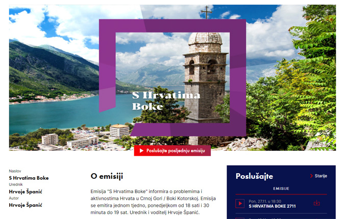 Понедељком увече, од 18.00 до 19.00 часова, на програму је емисија „Са Хрватима Боке“, у којој почесто гостују политичари из Hrvatske građanske inicijative, мањинске странке с великим амбицијама увијек када су у прилици да у црногорском Парламенту коалирају против српских интереса. Просјечан би слушалац ове емисије помислио како су Хрвати у Боки Которској и у Црној Гори угрожени, како им до свих људских права сужени пути, како живе, ако не тешко, а оно теже од осталих, те да им помоћ матице, државе Хрватске, потребна сада и одмах. Као човјек који познаје многе заливске Хрвате, као стари Бокељ који памти претке многих заливских Хрвата, као човјек који је у даљем сродству са актуелним предсједником Hrvatske građanske inicijative, тврдим да нико нити једног Хрвата не гледа попријеко, не жели му зло, нити му чини зло, не ради му о глави, напротив, сви са свима желимо мир, суживот, сарадњу и напредак.
