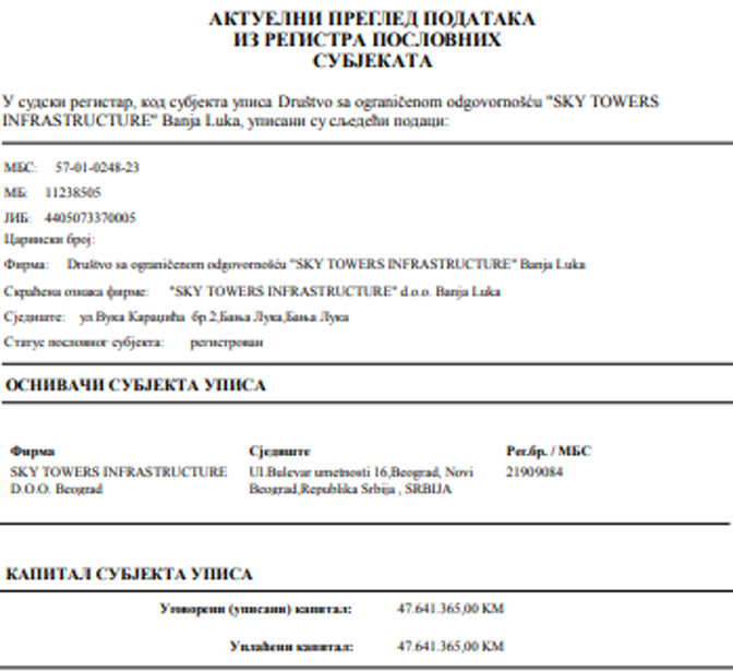 Нови власник бањалучке фирме је истоимена фирма из Србије – Sky Towers Infrastructure Београд.