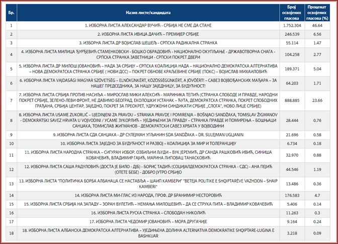Листа број 3 СРБИЈА ПРОТИВ НАСИЉА – ДОБРИЦА ВЕСЕЛИНОВИЋ – ПРОФ.ДР ВЛАДИМИР ОБРАДОВИЋ освојила 297.751 глас или 34,26 одсто и 42 мандата.