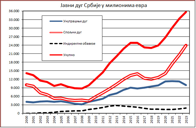Према доњем графикону, укупан јавни дуг Србије износи око 36 милијарди евра. Ако ту суму поделимо са бројем грађана Србије (око 6 милиона) :