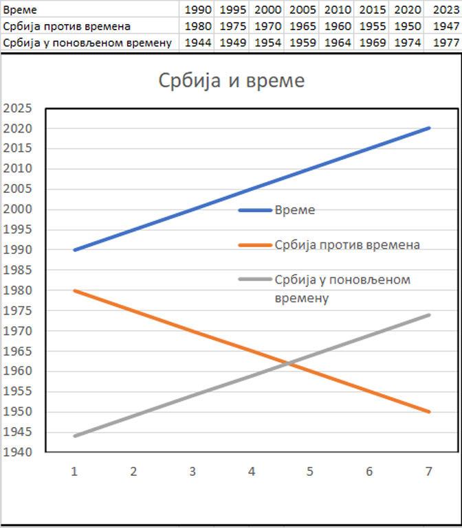 Овде смо увели у поређење два хипотетичка времена: (1) „Србија против времена“ – од 1990. враћамо се од 1980. године уназад, и (2) „Србија у поновљеном времену“ – од 1990. смо поновили 1944 и опет прошли кроз тај давни период.