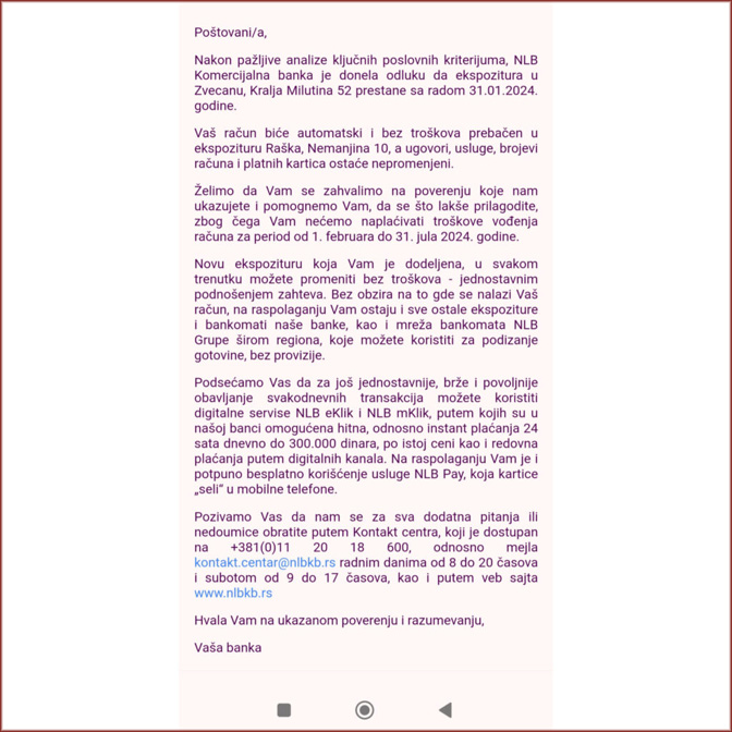 Више корисника НЛБ Комерцијалне банке на Косову и Метохији добило је вечерас обавештење на своје адресе електронске поште о затварању експозитура на КиМ 31. јануара 2024. године, сазнаје Контакт плус.