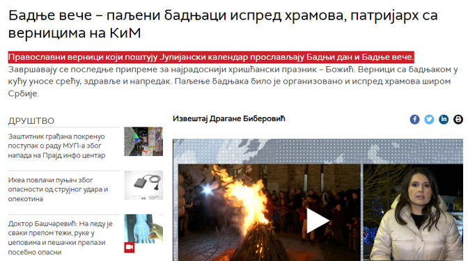 Вести на „Јавном сервису” Србије на Бадњи дан започињу реченицом „Верници који поштују Јулијански календар данас обележавају…” Брзим потезом прста искључује радио апликацију на телефону док новоустројена скаредна мантра не прође, потом кроз неколико минута опет укључује програм.