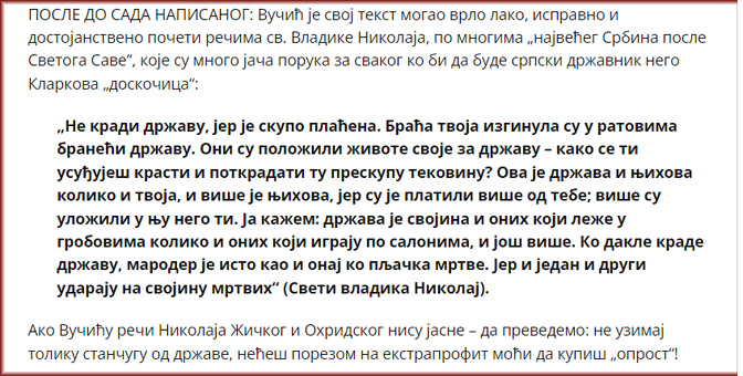 Не кради, дакле, ништа што је државно, и не навлачи зло на себе, на децу своју и на народ свој. Јер ко крађом тај отровом храни децу своју, храни их стрихнином.