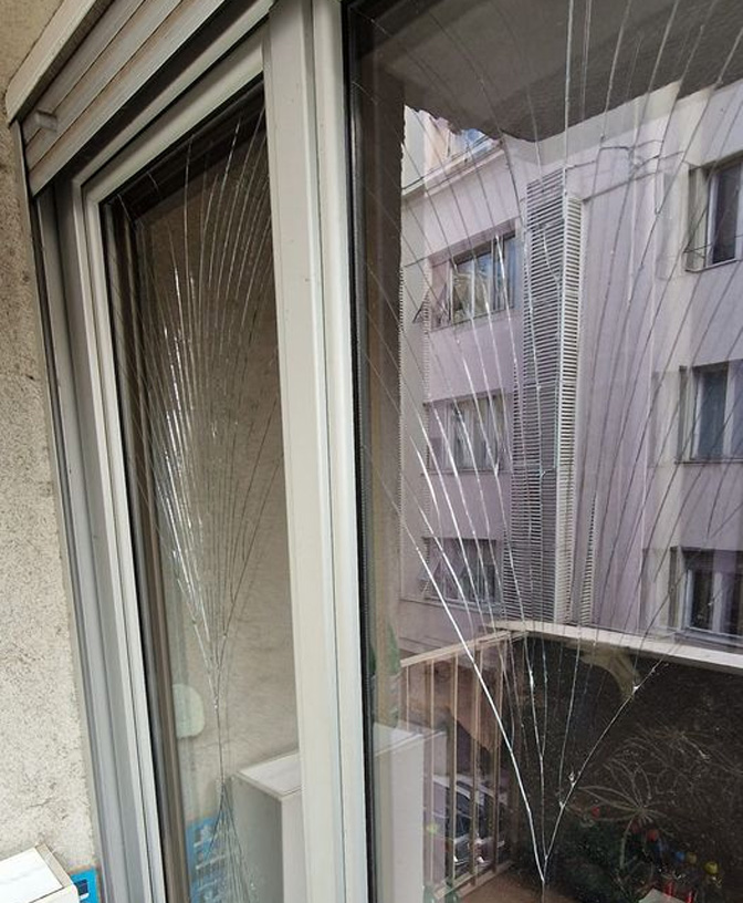 Фотографија ових стакала сведочи о увежбаном оку и руци пуцача из ваздушне пушке. Стакла на која је пуцао налазе се на вратима терасе стана моје тетке, испод Природно-математичког факултета. На овој фотографији виде се последица оба пуцња: 7. јануара 2021. и 17. децембра 2023. године.