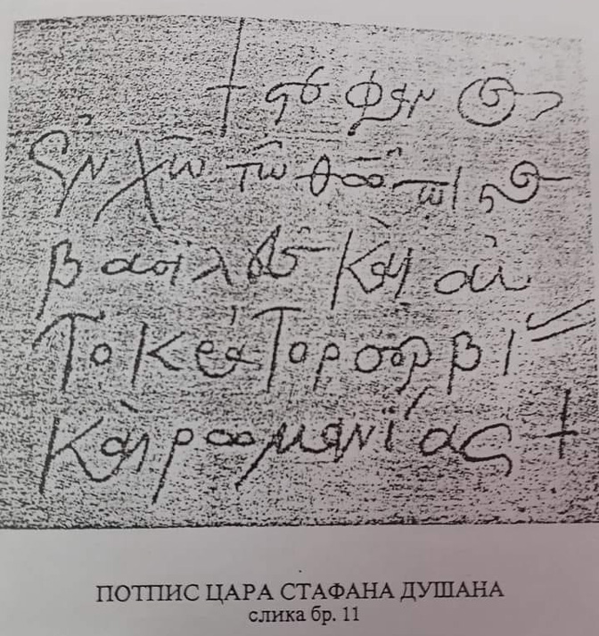 Потпис цара Стефана Душана на хрисовуљи светогорског манастира Св. Пантелејмона, 1348. године. Литература: Драшко Шћекић, ,,СОРАБИ“ историопис, Београд – Подгорица 1994.г., СЛИКА БР. 11, стр. 160-161. (Извор: Фејсбук)