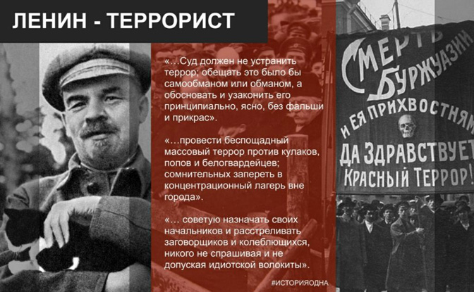 Поседујући велике стваралачке способности и меморију, Лењин их је ставио у службу антируске идеје рушења руског државног система. До почетка ХХ века, он је већ био потпуно изграђен тип антируског фанатика, спреман да употреби сва средства, а пре свега терор, да оствари своје циљеве. Већ 1901. године он је потпуно дефинисано изјавио: „Ми се у принципу никада нисмо одрекли и не можемо да се одрекнемо терора“ (Ленин В. И. ПСС. 4-е изд. Т. 36. С. 316).