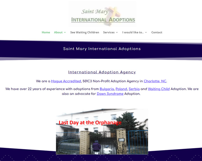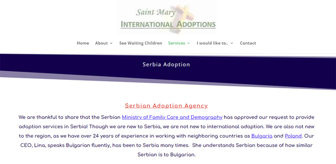 Америчка агенција из Северне Каролине „Сент Мери“ има крст у заглављу свог сајта и својим клијентима нуди услугу помоћи приликом усвајања деце из Србије.