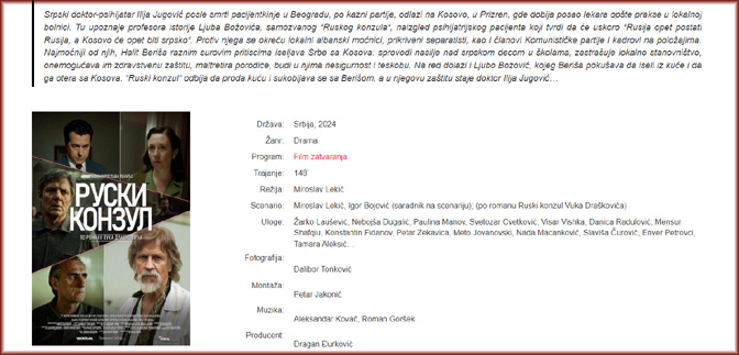О филму „Руски конзул“, снимљеном по роману Вука Драшковића, сценарио и режија Мирослава Лекића, сарадник на сценарију Игор Бојовић, глуме Жарко Лаушевић, Небојша Дугалић, Паулина Манов, Светозар Цветковић, Visar Vishka, Даница Радуловић, Mensur Shafqiu, Константин Фиданов, Петар Зекавица, Мето Јовановски, Нада Мацанковић, Славиша Чуровић, Енвер Петровци, Тамара Алексић, Србија, 2024, 148 минута