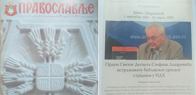 Српска православна црква одала је признање и захвалност Јовану Мирковићу, историчару и посвећеном хроничару геноцида који је извршен над српским народом у Павелићевој НДХ доделом вредног признања. За живот посвећен мукотрпном историографском трагању за документованим доказима о геноциду који је Независна Држава Хрватска чинила током Другог светског рата над српским народом, његовим светињама и свештенством, господин Мирковић је стекао уважавање академске заједнице, али и вечну захвалност свог народа коме је оставио капиталне публикације о злочину који остаје као упозорење против заборава.