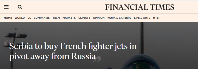 Београд планира набавку француских борбених авиона „рафал“ вредну три милијарде евра, показујући дугорочну посвећеност Западу након деценија ослањања на руске авионе, преноси Фајненшел тајмс (ФТ).