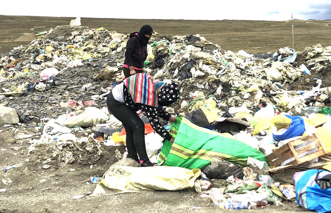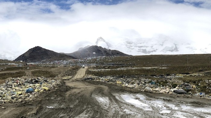 Појављују се гомиле ђубрета. Иза њих, две величанствене планине прекривене снегом. И иронични путоказ: „Добродошли у Ла Ринконаду. Не бацајте смеће.“