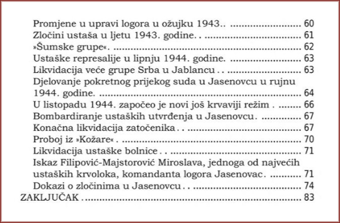 Otići u Jasenovac značilo je biti predan na milost i nemilost ustaškim koljačima, značilo je otići u mučeničku smrt. Crna je povijest jasenovačkog logora pokazala, da su ustaše poslali tamo sve one elemente, koje je trebalo likvidirati, jer su im bili nepoćudni „iz rasnih, vjerskih, nacionalnih ili političkih razloga“.