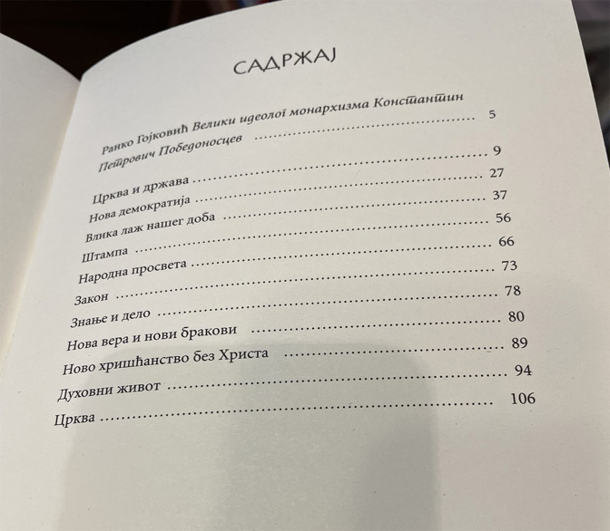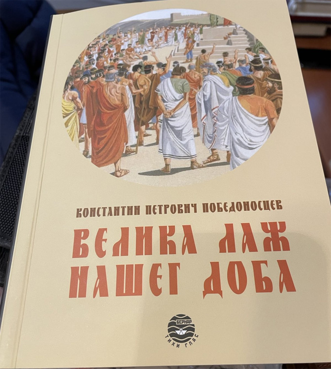 Победоносцев је аутор многих значајних радова, мноштва публицистичких текстова, али свакако најзначајније његово дело представља чувени „Московски зборник“ из 1896. године, дакле на самом почетку царствовања Цара-мученика Николаја II (1894 ступио на престо). Управо из тог капиталног дела направљен је избор текстова за књигу коју држите у руци. До данашњег дана ова књига нема конкуренцију када је у питању изузетно утемељена и аргументована критика западног парламентаризма и демократије. Његово бритко перо толико уверљиво и аргументовано истиче сву лажност идеја демократије, парламентаризма, слободе штампе, масонских парола о “братству, једнакости, слободи”, да је и данас ово дело више него актуелно и више него отрежњујуће у времену када је “диктатура демократије” доведена до апсурда. Наравно да сваки избор текстова са једне стране носи индивидуални печат, али сам се трудио да 11 текстова колико је ушло у ову књигу (од 29 колико их укупно садржи “Московски зборник”) буду текстови који су и данас веома актуелни и веома поучни. Поред горе поменутих тема, у овој књизи читалац ће наићи на бриљантну и разарујућу критику дарвинистичке “науке” (један истински научник, савременик Дарвина, рекао је за његову теорију да ту наука није ни преспавала), на префињен приказ заблуда западних хришћана, на изврсну анализу односа цркве и државе, а посебно импресионира дубока анализа протестантске јереси. Поглавље о штампи такође тера на размишљање и тешко је и данас наћи такву анализу апсурдности потпуног некажњавања новинара за многобројна зла, па и злочине, за које су, иако посредно, често одговорнији од самих политичара. Огледи о закону, о народној вери и народној просвети, такође су више него упечатљиви. Последње три главе књиге (Ново хришћанство без Христа, Духовни живот и Црква) говоре о најзначајнијим темама за живот људи, духовним и душевним темама, које стављају печат на целу књигу као на један изузетно важан приручник за ослобађање од свакојаких заблуда које данашње информативно друштво неминовно са собом носи, користан приручник сваком човеку који тежи спознаји Истине…