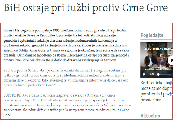 РСЕ: Господине Софтићу, да ли је коначна одлука да Босна и Херцеговина остане при тужби за геноцид и против Црне Горе пред Међународним судом правде у Хагу, с обзиром да је у Подгорици било извјесног релативизирања те информације да ће Сарајево остати при тужби и против Црне Горе?