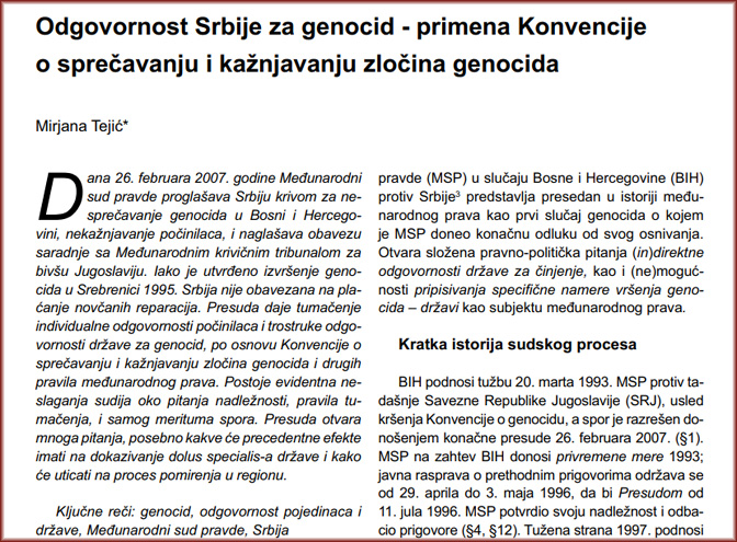Подсећања ради, без сагласности Републике Српске, „Влада“ Босне и Херцеговине поднела је 20. марта 1993. године тужбу Међународном суду правде (МСП) против Србије и Црне Горе (СРЈ) због, како је наведено, кршења Конвенције о геноциду.