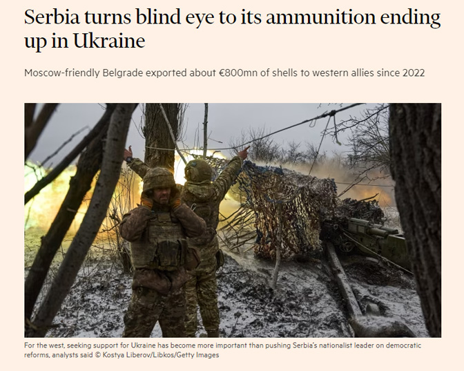 Лист Фајненшел тајмс је објавио процене да је Србија индиректно, преко других земаља, од почетка руске инвазије на Кијев извезла у Украјину муниције у вредности од 800 милиона евра.