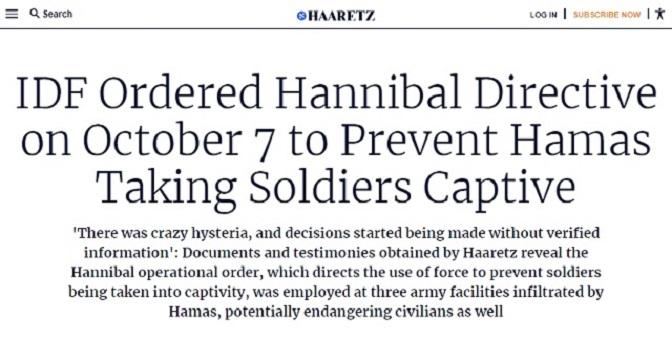 Послије осам мјесеци заташкавања и ширења дезинформација, израелски лист Харец признао је у недељу да је 7. октобра 2023. Израел побио много својих људи, поступајући према смјерници „Ханибал“.