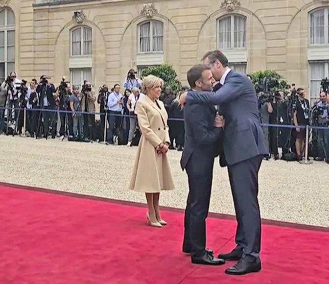 Емануел Макрон и Александар Вучић у Паризу, у позадини Брижит Макрон (Извор: НСПМ)