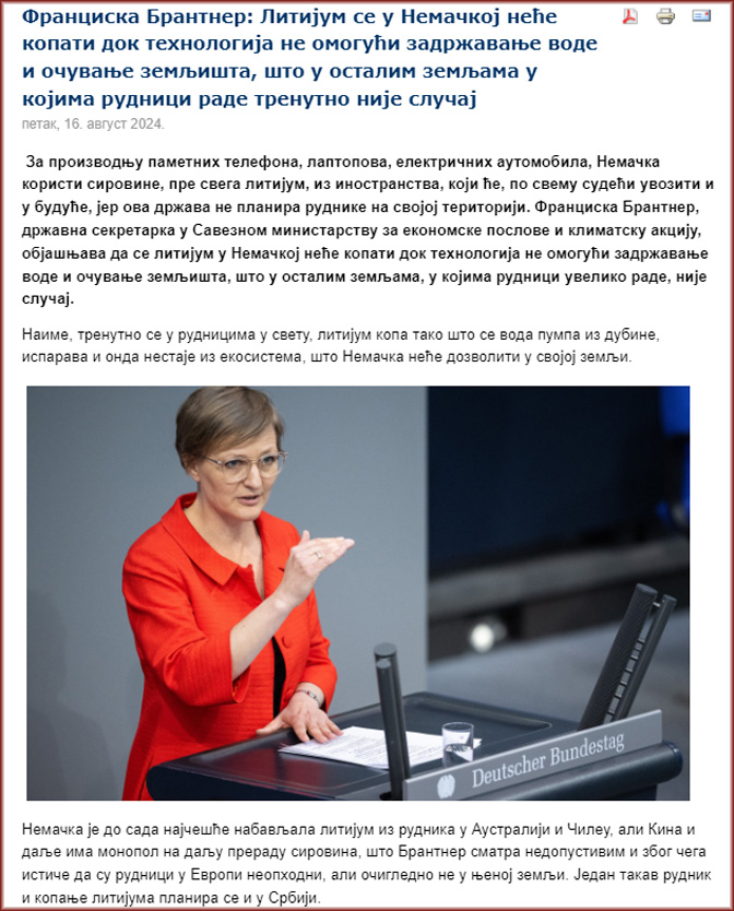 Франциска Брантнер, државна секретарка у Савезном министарству за економске послове и климатску акцију, изјавила је да није питање да ли ће се литијум у Србији копати, него да ли ће то урадити Рио Тинто и европски партнери или Кина.