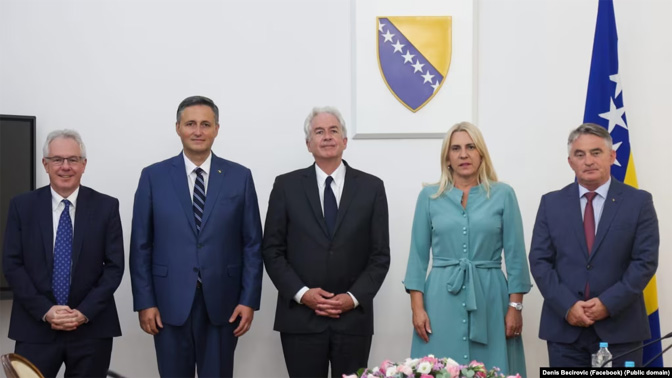 Мајкл Марфи, Денис Бећировић, Вилијам Бернс, Жељка Цвијановић и Жељко Комшић, Сарајево 20. август 2024. (Фото: РСЕ)