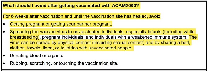 Трећа страна саопштења ФДА о вакцини АКАМ 2000 из августа 2024: „Шта би требало избјегавати по вакцинацији вакцином АКАМ 2000? Шест недеља по вакцинацији или док рана од вакцинације не зарасте избјегавајте: да затрудните, или да затрудни ваш партнер; преношење вируса из вакцине на невакцинисане појединце, нарочито одојчад (укључујући дојењем). Вирус се може пренијети физичким додиром (укључујући сексуални) или коришћењем заједничког кревета, одјеће, пешкира, постељине и средстава за хигијену“