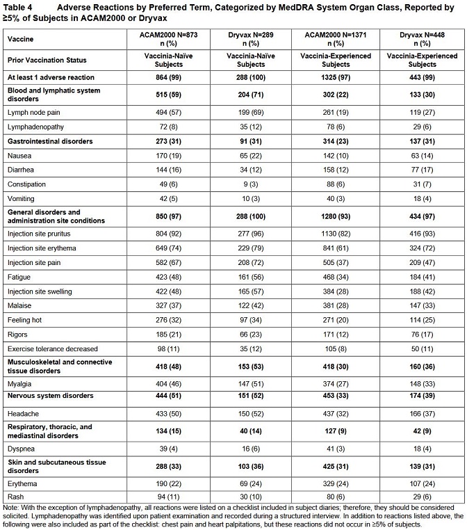 Прва страна саопштења ФДА (из августа 2024) о вакцини АКАМ 2000: „АКАМ 2000 садржи живи вирус који се може пренијети на појединце у блиском додиру с вакцинисаном особом. Озбиљне компликације укључују: миокардитис, перикардитис, запаљење мозга или кичмене мождине, озбиљне кожне инфекције, смрт фетуса, случајну инфекцију ока, озбиљне алергијске реакције по вакцинацији“
