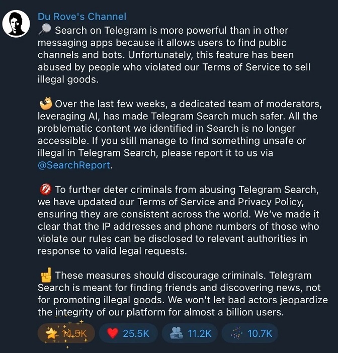Ове мјере требало би да обесхрабре криминалце. Претрага на Телеграму намијењена је проналажењу пријатеља и тражењу вијести, не промовисању робе забрањене законом. Нећемо дозволити лошим учесницима да угрожавају интегритет наше платформе која опслужује скоро милијарду корисника.“