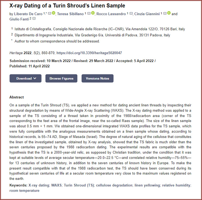Група италијанских научника је у марту/априлу 2022. године провела истраживање Торинске плаштанице користећи најновије рендгенске уређаје и установила да је платно заиста из I вијека нове ере. Плаштаницу су поредили са сличним узорком тканине из Масаде (чувене тврђаве у Израелу), за који се несумњиво зна да потиче из раздобља од 55. до 74. године нове ере, установивши да се својства тканина савршено подударају.