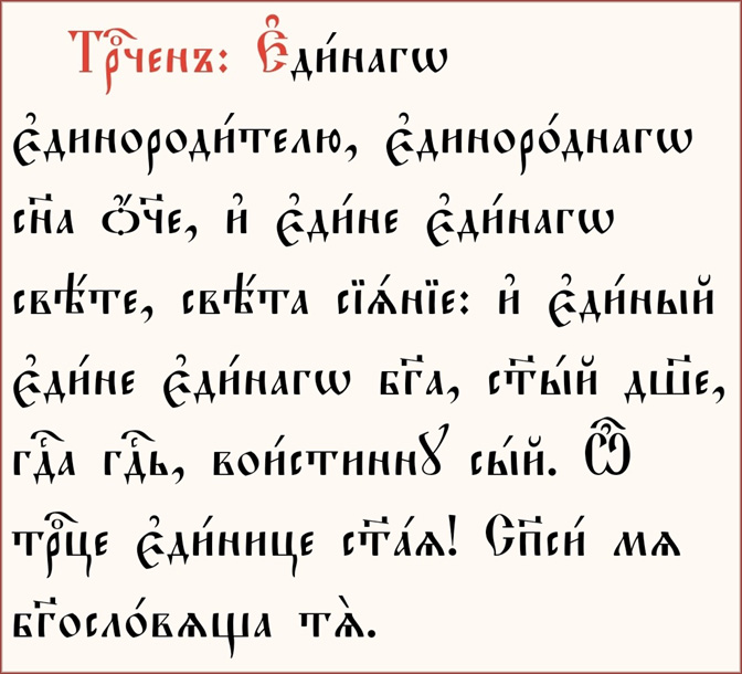 „Троичен: Јединаго Јединородитељу, Јединороднаго сина Отче, и Једине Јединаго свјете, свјета сијаније: и Јединиј Једине Јединаго Бога, Свјатиј Душе, Господа Господ, воистину Сиј. О Тројице Јединице Свјатаја! Спаси мја богословјашча Тја“.