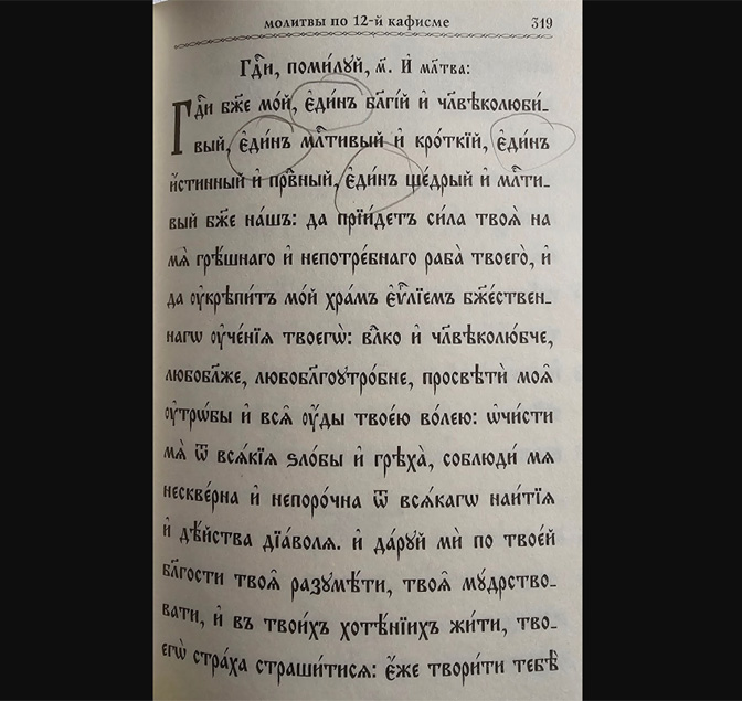 „Господи Боже мој, Једин благиј и человјекољубивиј, Једин милостивиј и кроткиј, Једин истиниј и праведниј, Једин шчедриј и милостивиј Боже наш:…“