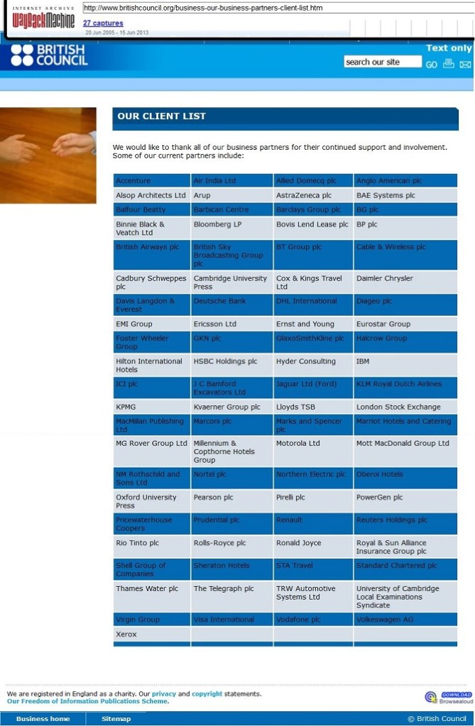 Британски савјет, званични орган британске државе, на некад јавно доступном списку својих „клијената“ има и сљедеће фирме: AstraZeneca, BAE Systems, Balfour Beatty, Barclays Group, Bloomberg, BP, British Airways, BT Group, Cable & Wireless, Cadbury Schweppes, Deutsche Bank, Ernst and Young, GlaxoSmithKline, HSBC Holdings, IBM, ICI, Lloyds, London Stock Exchange, Marconi, Marks and Spencer, PowerGen, Pricewaterhouse Coopers, Prudential, Renault, Reuters Holdings plc, Rio Tinto, Rolls-Royce, Royal & Sun Alliance Insurance Group, Shell Group of Companies, Thames Water plc, The Telegraph plc, Virgin Group, Visa International, Vodafone, Volkswagen… О, ту је и NM Rothschild and Sons Ltd.