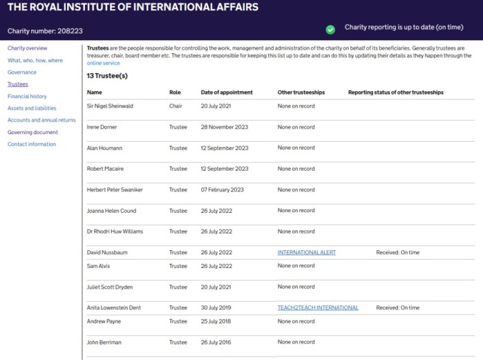 Пошто Четам хаус тврди да је „добротворна организација“, сви повјереници су наведени у регистру Комисије за добротворне организације.