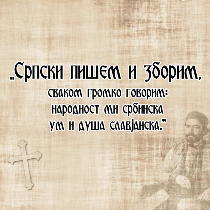 Српски пишем и зборим / сваком громко говорим: / народности ми србинска, / ум и душа славjанска