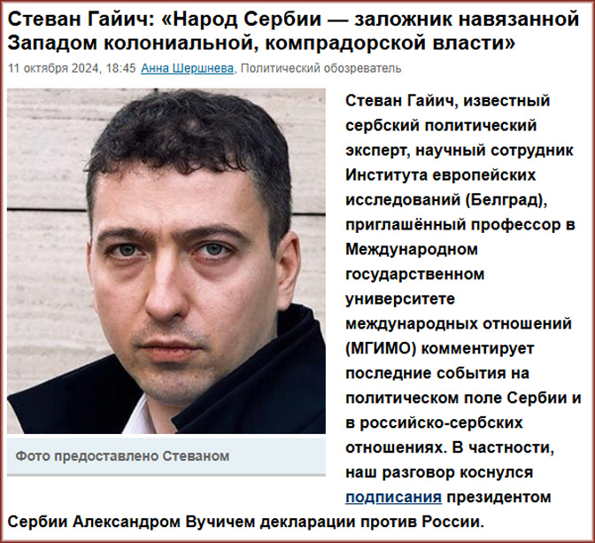 Стеван Гајић, познати српски политички стручњак, научни сарадник Института за европске студије (Београд), гостујући професор на Московском државном универзитету за међународне односе (МГИМО), коментарише најновија политичка дешавања у Србији и руско-српске односе. Конкретно, наш разговор се дотакао потписивања декларације против Русије председника Србије Александра Вучића.