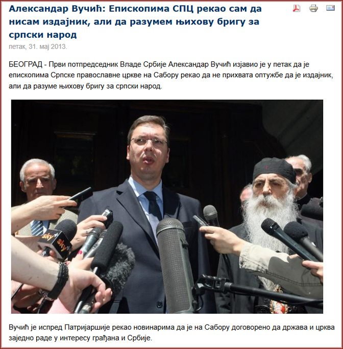 Управо је из Новог Сада пристигла клерикална подршка потписивању сепаратистичког Бриселског споразума о Косову и Метохији (2013), којим су се обезбожени Ивица Дачић и Александар Вучић одрекли Северне Косовске Митровице, Зубиног Потока, Звечана и Лепосавића, и свега Распетога Косова и Метохије.