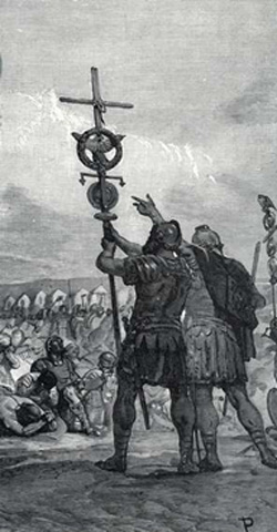 Постављајући круну на врх Крста, војници су заједно са будућим царем клекли на колена док је он са сузама у очима почео да узноси молитве Богу. Затим је устао дижући руке ка небу рекао: „Ти, Господе, Боже свемогући и Свети, који познајеш сва срца; буди данас сведок слуги своме да није желео ову силу нити ово царство које има своје завршетак; јер се радујем гозби која се не завршава и чекам је. Од сада, Господе, пошто је таква била воља Твоја и пошто ме је благодат Твоја позвала да будем вођа и цар грешницима који траже заштиту Крста твога и траже спас Твој, молим Те, моћни Господе, да ова сила не буде штетна по душу моју, болна за дух мој, и да ми не буде на осуду; да ми буде на смирење моје душе, да се разведем од мога духа,? за моје самопоуздање, за покој од твог Божанства, ради помирења људи, за мир цркава, повратак њене деце и постојање наше вере; за покоравање и спас обманутих, да одступе од свог греха и прихвате Тебе. Што се мене тиче, грешника и кривца, недостојног круне на коју ме је позвала Твоја божанска воља, дај ми да ја будем достојан Твоје милости, да прихватим ову круну од благословене деснице Твоје пуне светости, и да бих у Теби имао славу (поштовање) у свим царствима на земљи.“