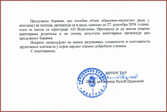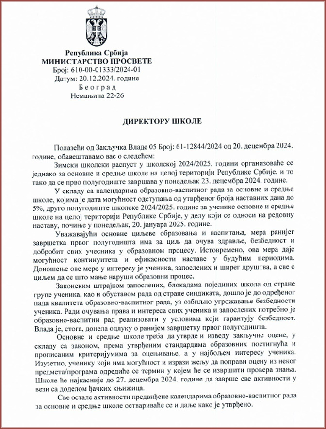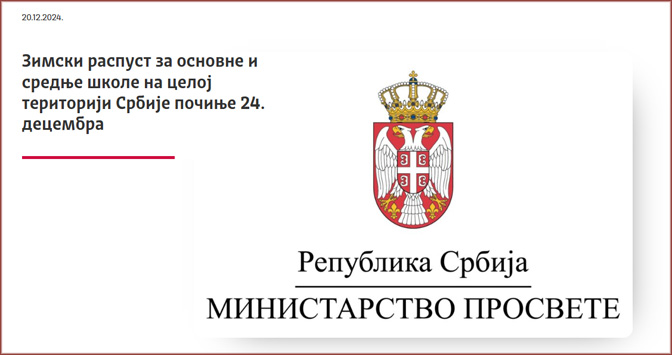 Надлежни су донели изненадну одлуку да се прво полугодиште заврши недељу дана раније за ђаке у централној и јужној Србији и да ће и њима, баш као и њиховим вршњацима у Војводини, зимски распуст почети 24. децембра.