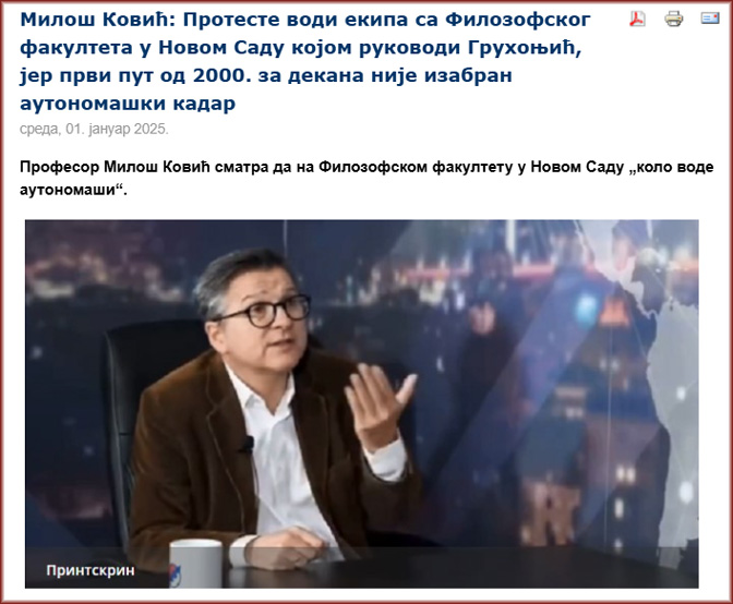 – На Филозофском факултету коло воде аутономаши. То је сад микро… то је резултат разговора са колегама са Филозофског факултета у Новом Саду, то што сада кажем. Дакле, тамо су аутономаши по први пут изгубили Филозофски факултет, позицију декана, од 2000. године. Сада је дошла једна пронапредњачка, хајде да кажемо, екипа, која није напредњачка. Ту има правих напредњака, има оних који нису напредњаци, у садашњој управи Филозофског факултета у Новом Саду. У сваком случају, они су нешто друго.