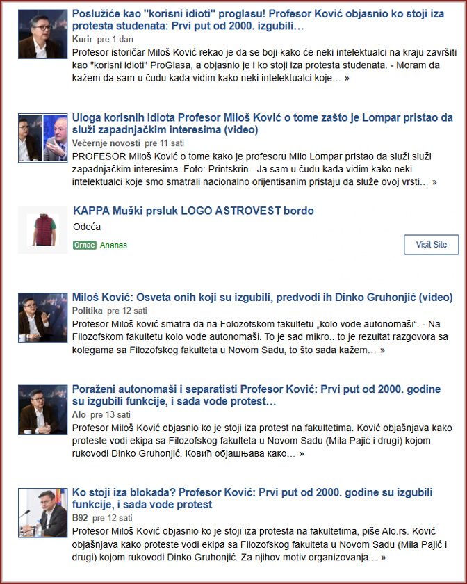 Нагласио сам да су захтеви студената потпуно праведни и да би свако ко је разуман требало да их подржи. Одговорни за трагедију у Новом Саду морају да буду приведени правди. Србија мора да буде правна држава; кидисање батинаша на било кога, нарочито на студенте, мора да буде најстроже кажњено. Изнео сам, међутим, чуђење због тога што на овим протестима, потпуно исто као у време протеста „Србија против насиља“, нико не помиње Вучићеву издају Косова, опасност која прети Универзитету и студентима у Косовској Митровици, пљачку и страдање наших сународника на Косову и Метохији. На основу увида у то ко води и организује протесте на Филозофском факултету у Новом Саду указао сам на опасност од тога да се, после сецесије „Косова“, суочимо са војвођанским сецесионизмом (изгледа да сам у понечем и погрешио – у међувремену сам сазнао да у управи Филозофског факултета у Новом Саду, са можда једним изузетком, седе независни и слободни људи). Сличне бојазни изнео сам и поводом утицаја који на протесте у Београду имају пронатовски медији, невладине организације и странке. Са жаљењем сам приметио да има патриота који, по мом мишљењу, наивно верују да ће приступањем овом блоку помоћи да се Србија спасе пошасти распарчавања, пљачке и криминала. Уместо тога, могли би да послуже пуком преласку из једног у други колонијални, компрадорски режим.