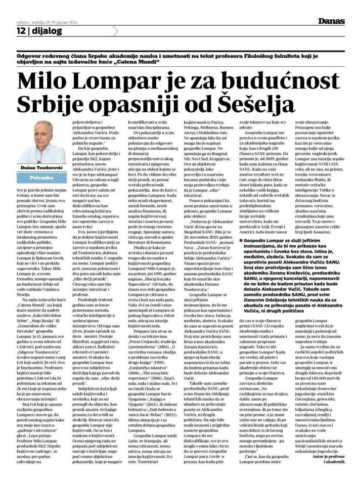 Н1 је Даницу Црногорчевић, која је подржала студенте, назвала „певачица са националистичким репертоаром“, Аутономија.инфо објављује гнусан текст против професора Ломпара „Кроз снајперски нишан српског становишта“, а „Данас“ поклања целу страну Душану Теодоровићу за његов рад: „Мило Ломпар је за будућност Србије опаснији од Шешеља“ (18-19.1.2025, стр. 12).
