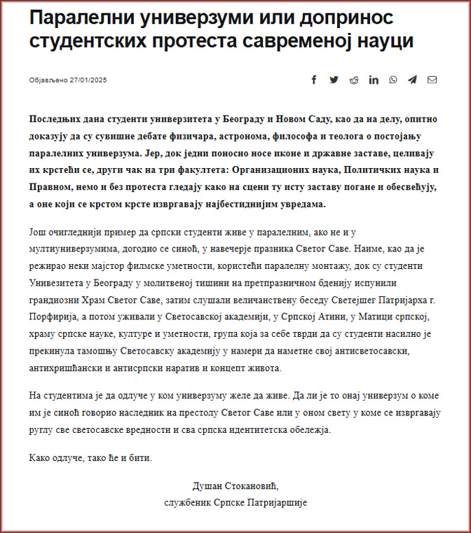 Но, да се вратимо брату Душану Стокановићу, аутору тог спорног текста под називом „Паралелни универзум или допринос студентских протеста савременој науци“, који се одлично уклапао у све оно што се могло чути из званичних извора наше свете Цркве, али није био дисонантан ни лијепо упакованим духовним поукама и бесједама неких професора чију неутралност ремети само тајминг.