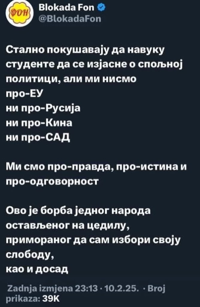 Ми, грађани Србије, и Срби уопште, са свих страна света, вас подржавамо и молимо вас да не посустанете али и да се мудро чувате превртљивих злонамерника из политикантске касте Србије – и садашњих и бивших, као и страних медоусних поробљивача и разбојника, јер сви они једва чекају да вас положе као невину жртву на олтар Власти, која им је најважније оруђе за одржавање у животу поганом од лажи и отимачине.