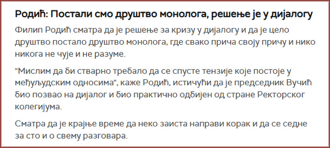Овим речима, покушао је недавно, приликом гостовања на РТС-у у емисији „Таковска 10“ да своју позицију спрам студентских протеста објасни Филип Родић. Да је рекао било шта друго, слагао се ја са тим или не, не бих трошио време на писање ових скромних редака, али ове две реченице траже одговор, који ћу покушати да сажмем што је могуће више.