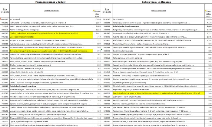 2. На претпоставку Саше Лазаревића пренету на Стању ствари упућује увоз беспилотних летелица из Израела, тежих од 7 килограма у вредности од 399 хиљада евра. На супротној страни, код Израела постоји позиција „Ваздухоплови и друге летелице с погоном неоптерећене лакше од 2.000 кг“, у вредности од 376 хиљада евра. И овај увоз, опет, може да се односи на дронове који се користе у пољопривреди, или у друге комерцијалне сврхе.