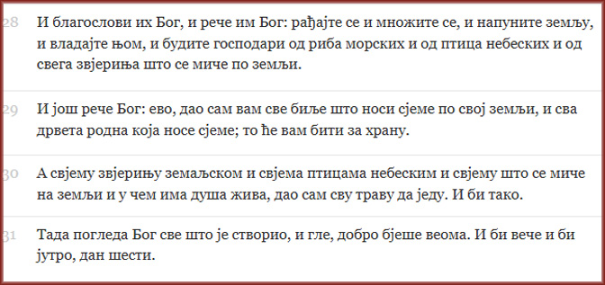 Прва књига Мојсијева, 1:28–31 (Превод Ђ. Даничића)