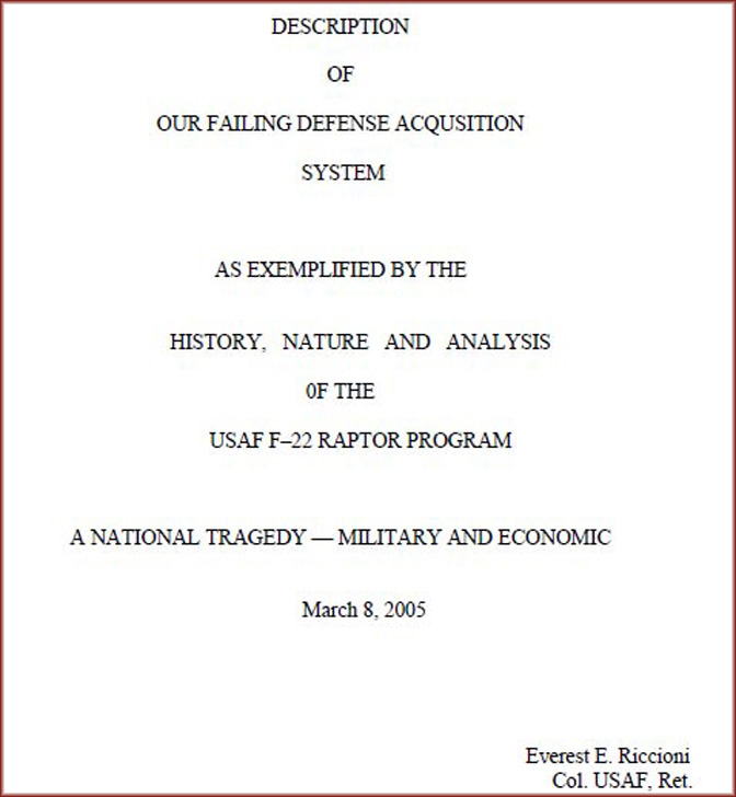 „Description of our failing acquisition system as exemplified by the history, nature and analysis of the USAF F-22 Raptor program; A national tragedy – Military and Economy“ из 8. марта 2005. године, наводи следеће, а након обарања првог „stealth” јуришника F-117A 27/03/1999. године: