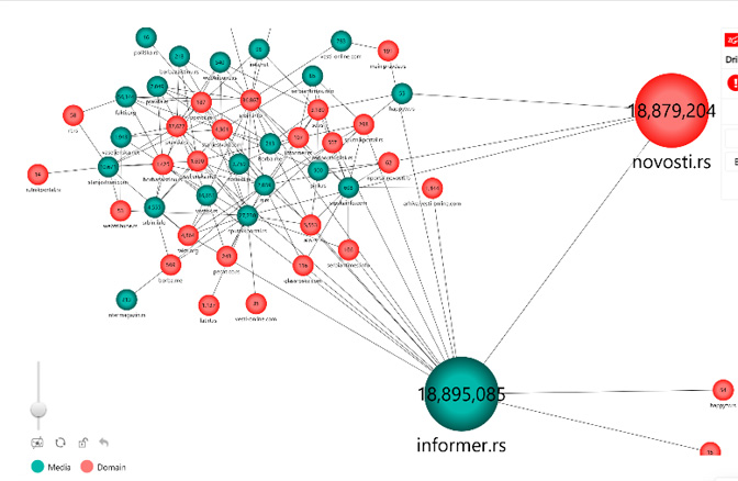 Analiza je pokazala da je sajt Informera najrazgranatije čvorište u ovoj mreži, ka kome vode linkovi (oko 20 miliona njih) sa najviše različitih sajtovaširom interneta. Najviše beklinkova Informeru dolazi sa Večernjih novosti (oko 18 miliona), dok u obrnutom smeru, od Informera ka Večernjim novostima, ide oko 28 miliona veza. Na taj način se pomenuta dva sajta pozicioniraju kao potencijalno najmoćnija medijska „osovina” kada je reč o internet portalima u Srbiji, saveznici čije poruke dolaze do ogromne publike.