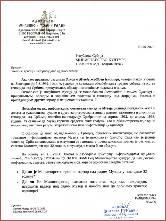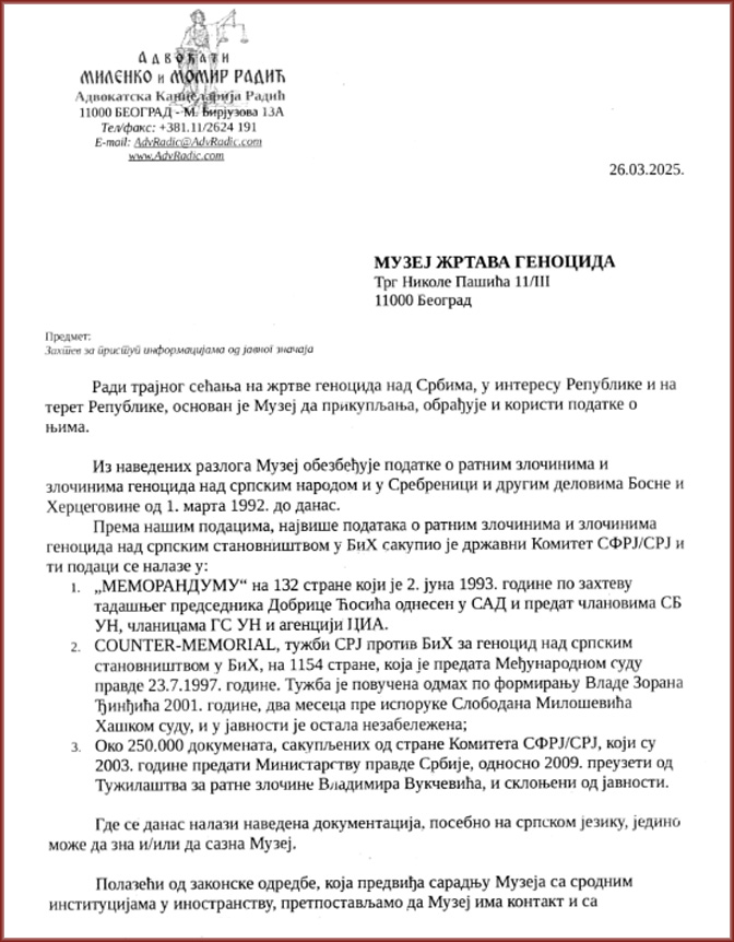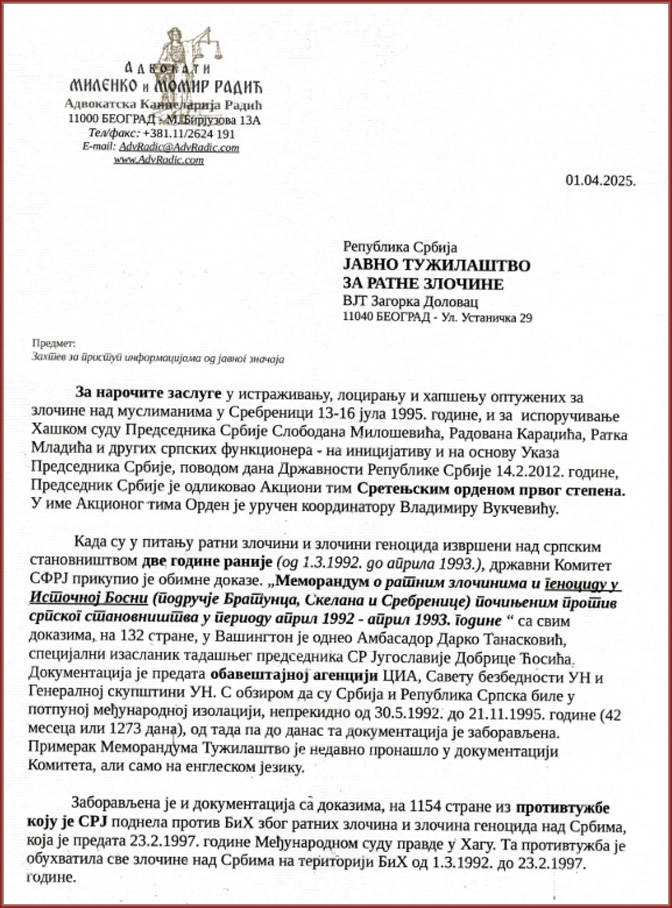 Због непостојања поузданих информација о судбини докумената о злочинима над српским становништвом у БиХ, за период од 1. 3. 1992. до 12. 7. 1995. године, а под утиском да Србија није заинтересована, или да јој није допуштено веће ангажовање у отварању поступака у вези ратних злочина и злочина геноцида учињених над Србима, посебно на подручју Сребренице у периоду од априла 1992. до априла 1993. године – на основу чл. 15. ст. 1. Закона о слободном приступу информацијама од јавног значаја (Сл. гл. РС бр. 120/04-36/10) захтевамо од Јавног тужилаштва за ратне злочине да нам електронским или другим путем пружи информације и/или да нам достави копије аката у вези са следећим питањима:
