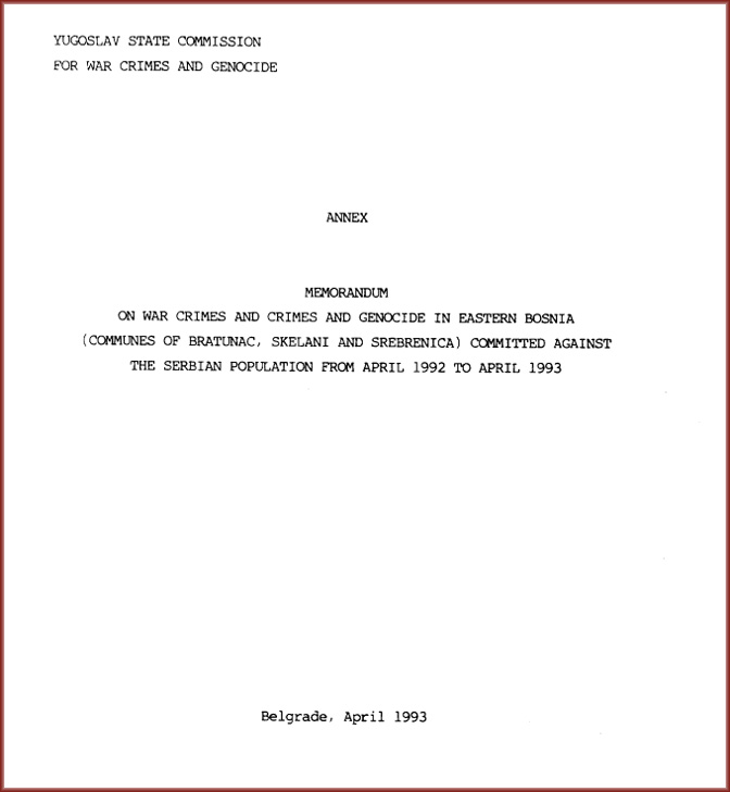Када су у питању ратни злочини и злочини геноцида извршени над српским становништвом две године раније (од 1. 3. 1992. до априла 1993), државни Комитет СФРЈ прикупио је обимне доказе. „Меморандум о ратним злочинима и геноциду у Источној Босни (подручје Братунца, Скелана и Сребренице) почињеним против српског становништва у периоду април 1992 – април 1993. године“ са свим доказима, на 132 стране, у Вашингтон је однео Амбасадор Дарко Танасковић, специјални изасланик тадашњег председника СР Југославије Добрице Ћосића.